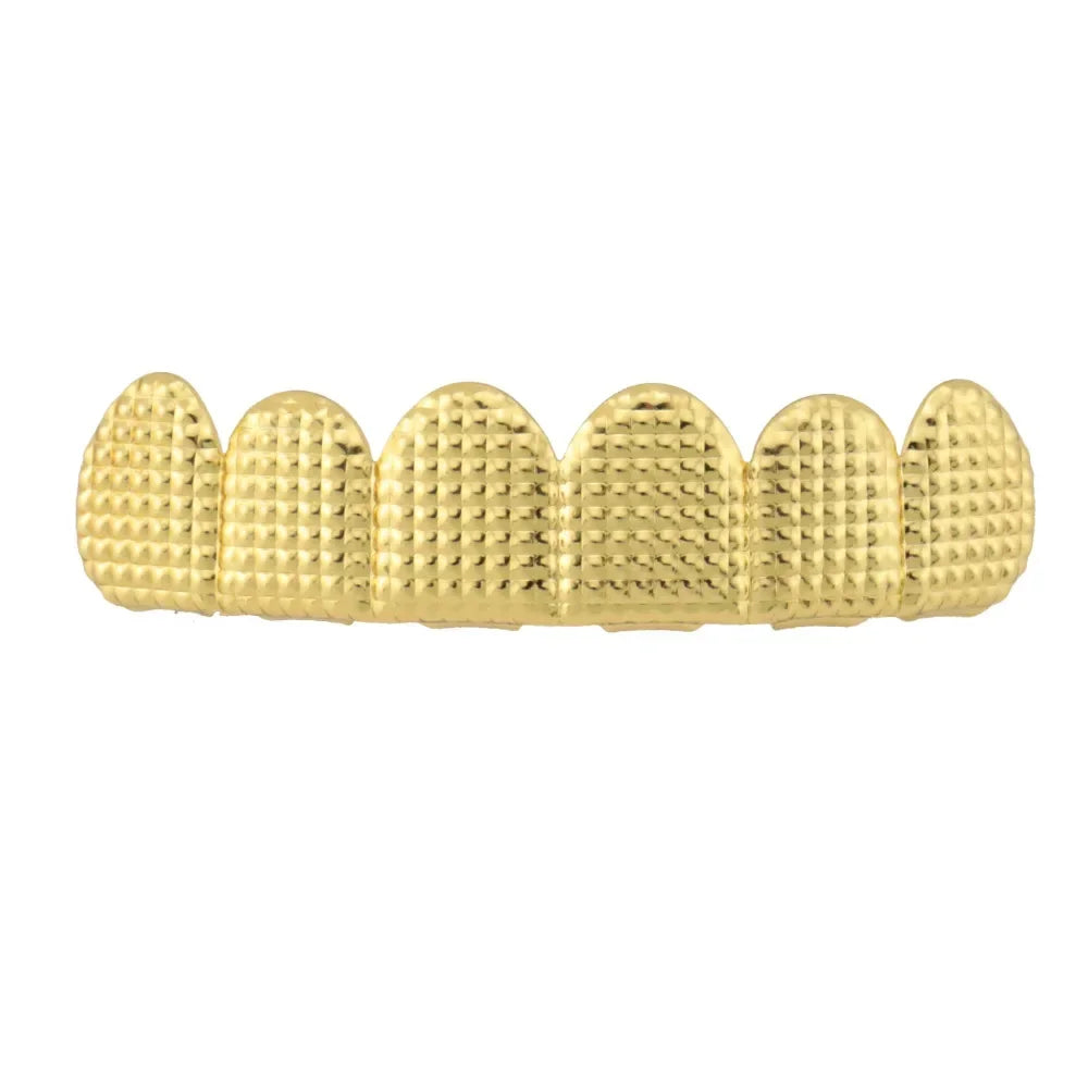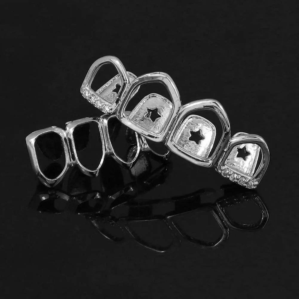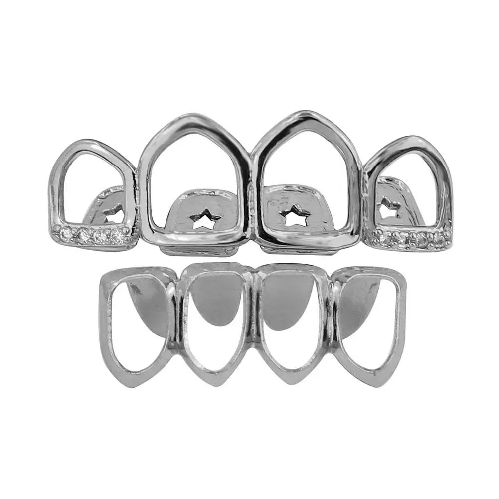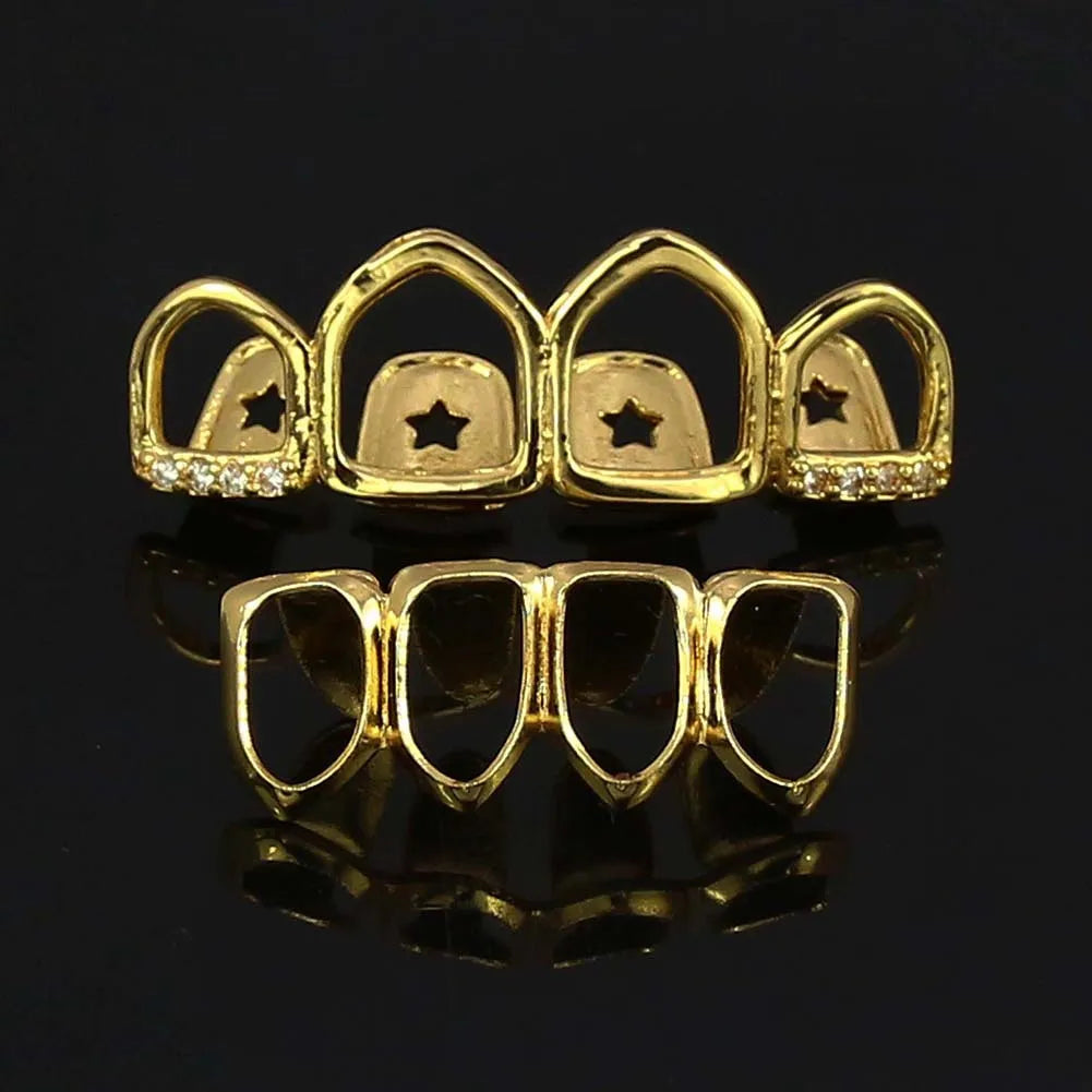 14K Gold Plated Hip Hop 4/4 Hollow Zircon Teeth Grillz For Women Men CZ Stone Tooth Caps Body Jewelry Star Tooth Sheath