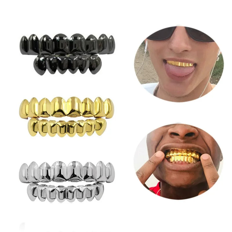 18K Gold Silver Plated HIP HOP Teeth Grillz Top & Bottom Grills Set With silicone Real Shiny Vampire Tooth Sets