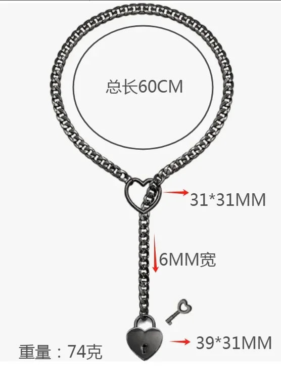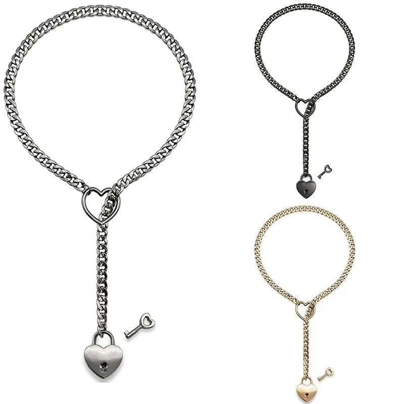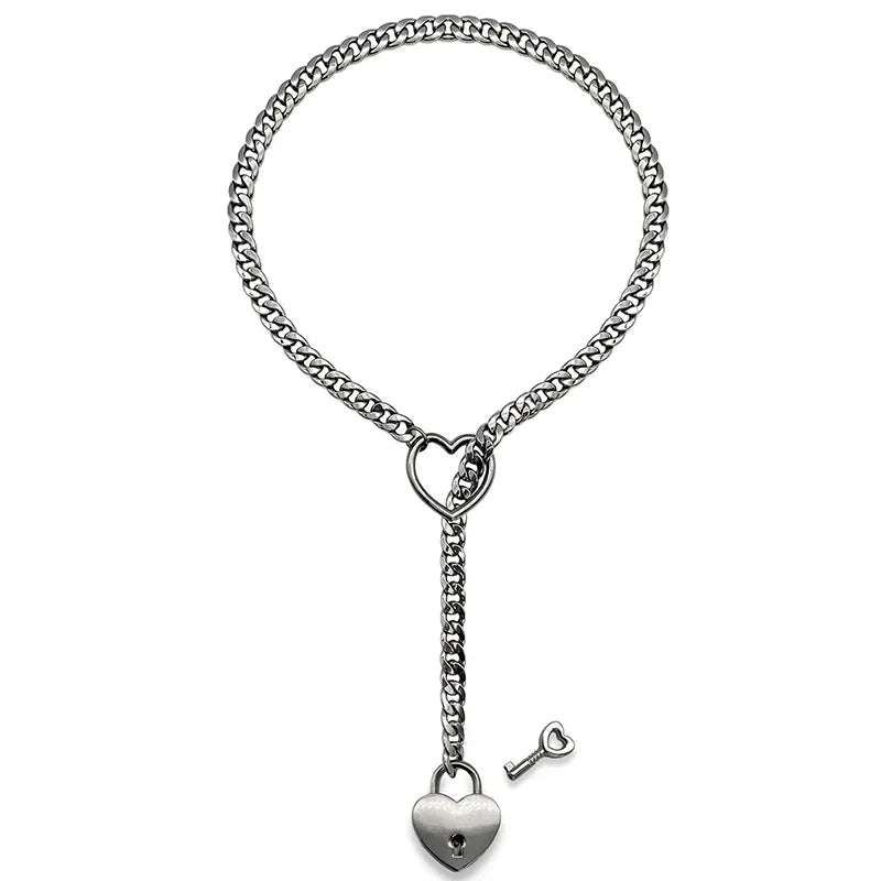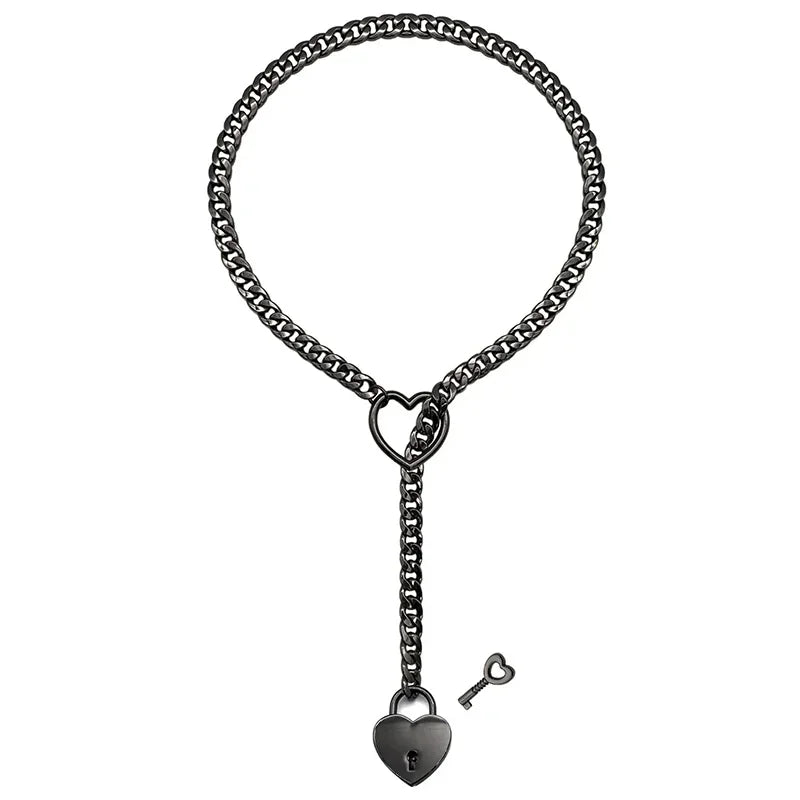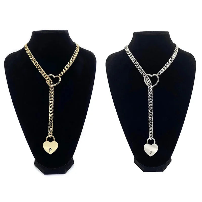 Womens Slip Chain Necklace Heart O-Ring Punk Rock Cuban Long Necklace Jewelry Adjustable Necklace Heart Locker With Key