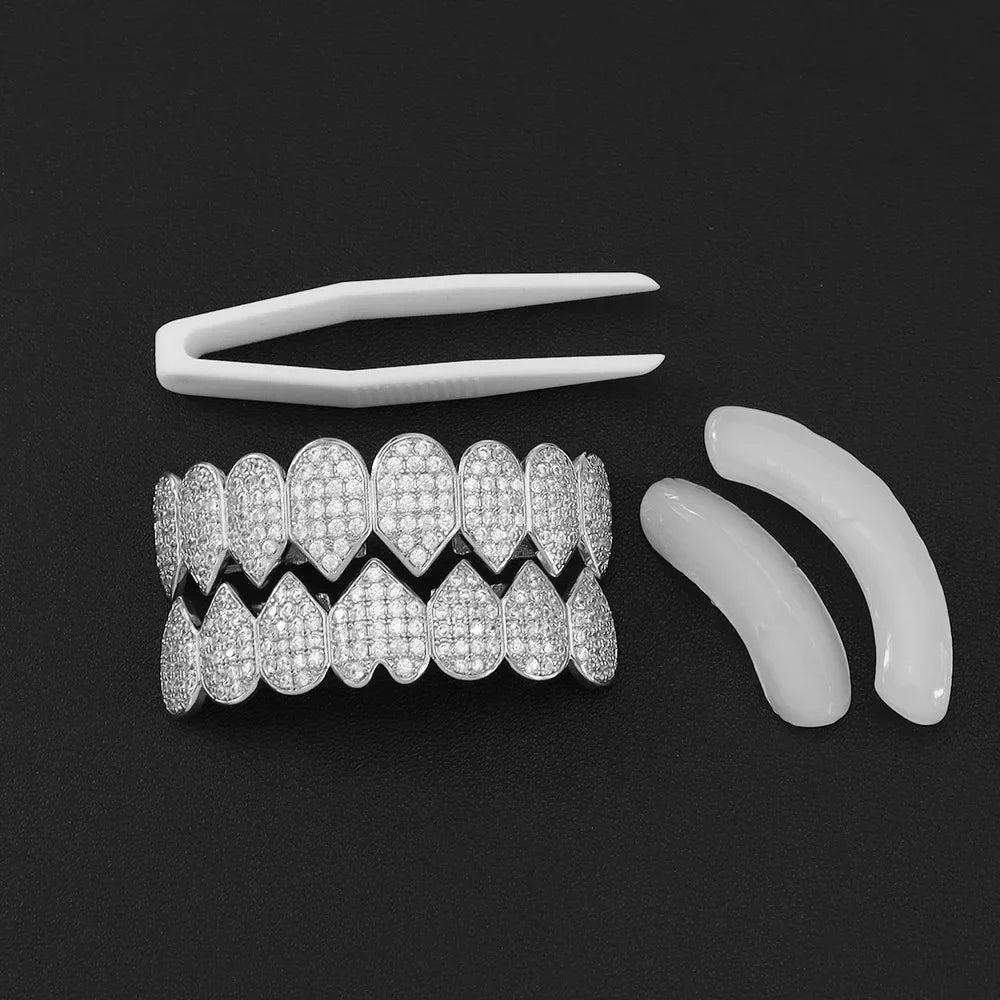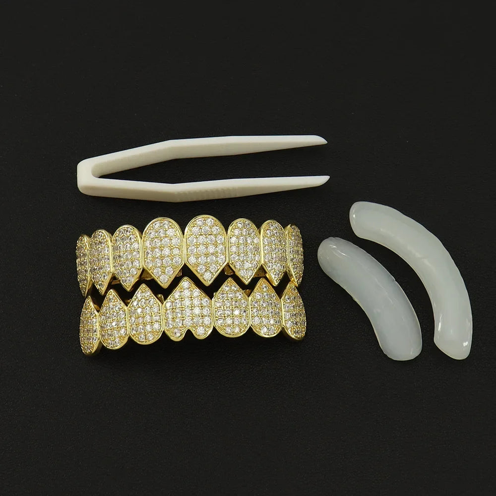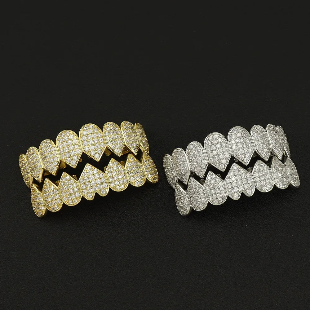 Hip Hop CZ Teeth Grillz Set For Unisex Top Bottom Mouth Gold Silver Color Teeth Grills LoveTooth Removable Fashion Jewelry